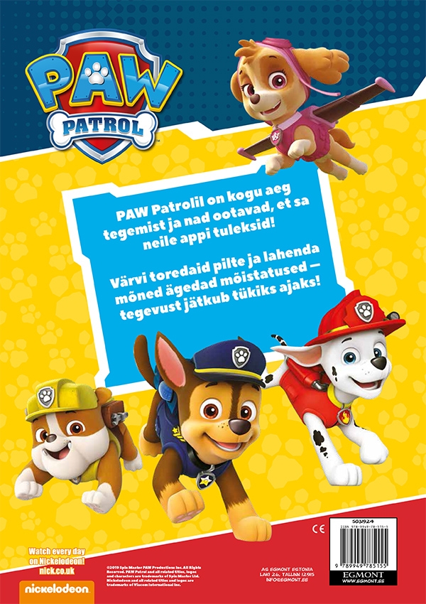 Paw Patrolil on kogu aeg tegemist ja nad ootavad, et sa neile appi tuleksid! Värvi toredaid pilte ja lahenda mõned ägedad mõistatused – tegevust jätkub tükiks ajaks! NB! TEGEMIST ON VIIMASTE KOOPIATEGA, MILLE KAANED VÕIVAD OLLA PISUT KANNATADA SAANUD, SISU SELLEGIPOOLEST AEGUMATU!