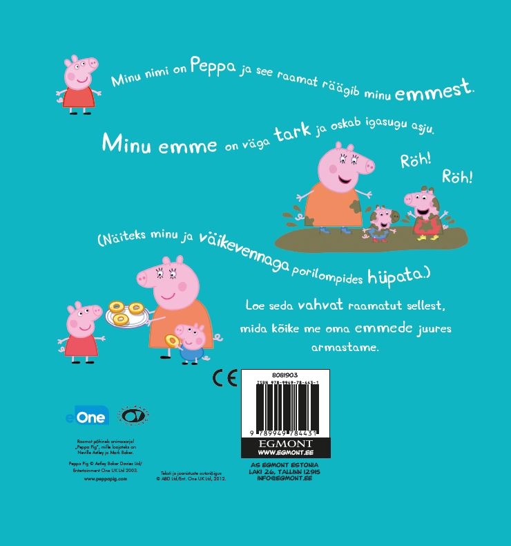 Minu nimi on Peppa ja see raamat räägib minu emmest. Minu emme on väga tark ja oskab igasugu asju. Röh! Röh! (Näiteks minu ja väikevennaga porilompides hüpata.) Loe seda vahvat raamatut sellest, mida kõike me oma emmede juures armastame.