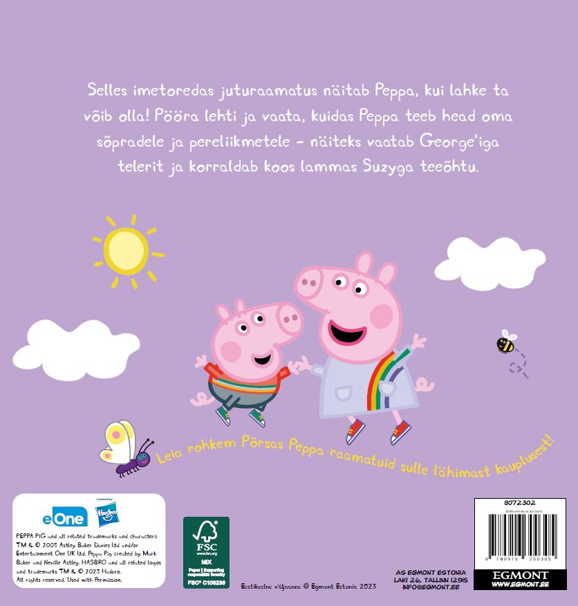 | Selles imetoredas juturaamatus näitab Peppa, kui lahke ta võib olla! Pööra lehti ja vaata, kuidas Peppa teeb head oma sõpradele ja pereliikmetele – näiteks vaatab George’iga telerit ja korraldab koos lammas Suzyga teeõhtu. |