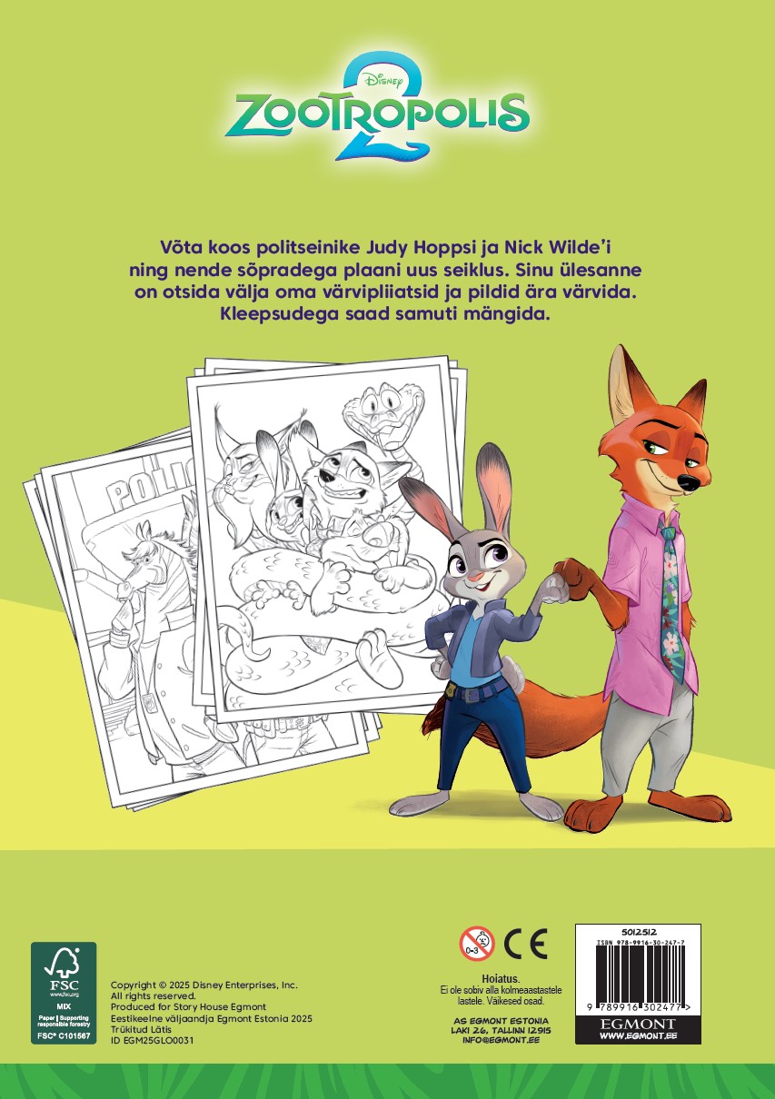 Võta koos politseinike Judy Hoppsi ja Nick Wilde’I ning nende sõpradega plaani uus seiklus. Sinu ülesanne on otsida välja oma värvipliiatsid ja pildid ära värvida. Kleepsudega saad samuti mängida.
